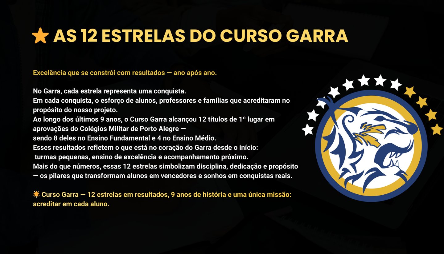 Especialistas na preparação de alunos para o Colégio Militar. Nosso método é estruturado para oferecer ensino de alta performance, foco no aprendizado real e acompanhamento personalizado para cada estudante.