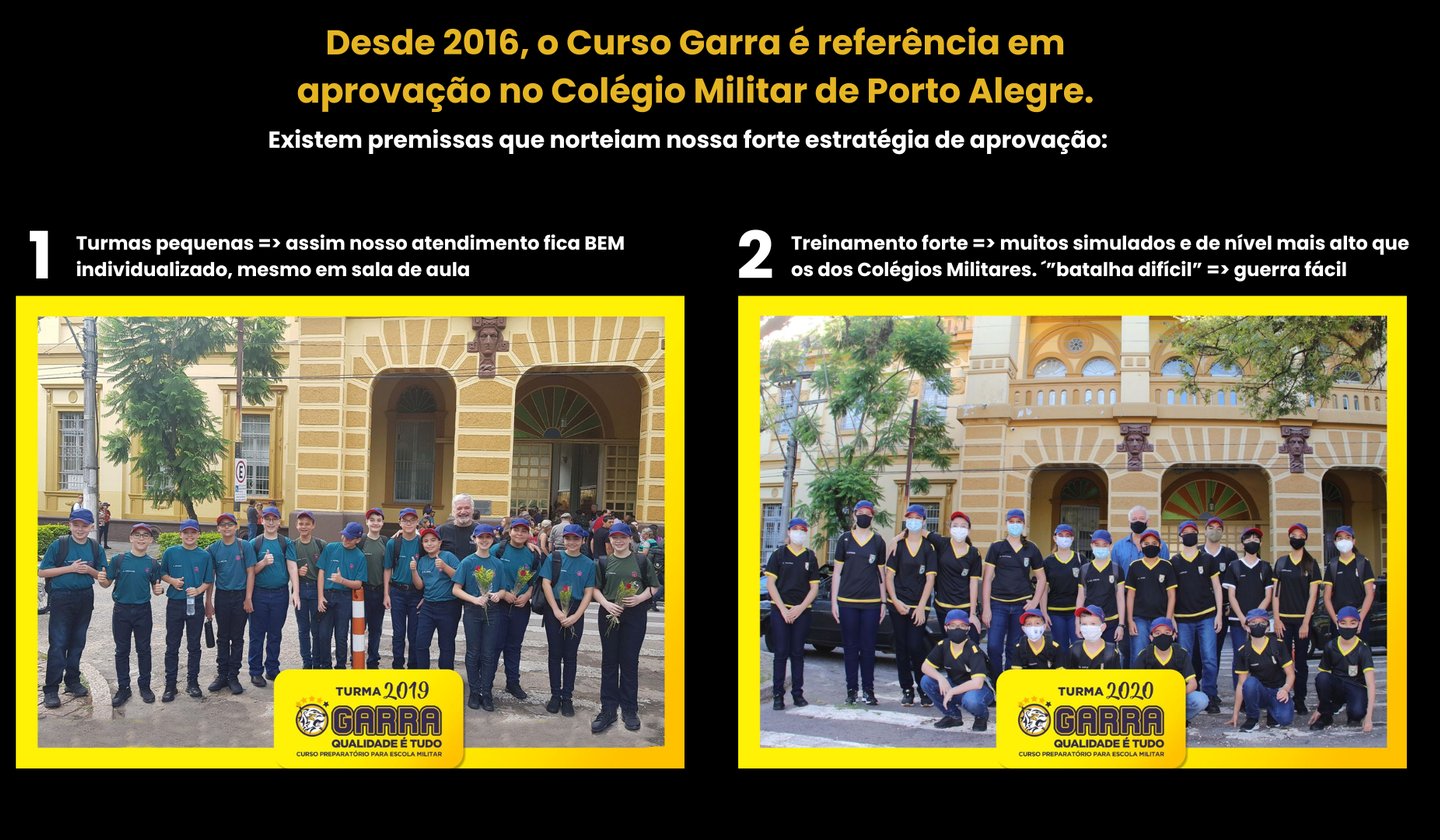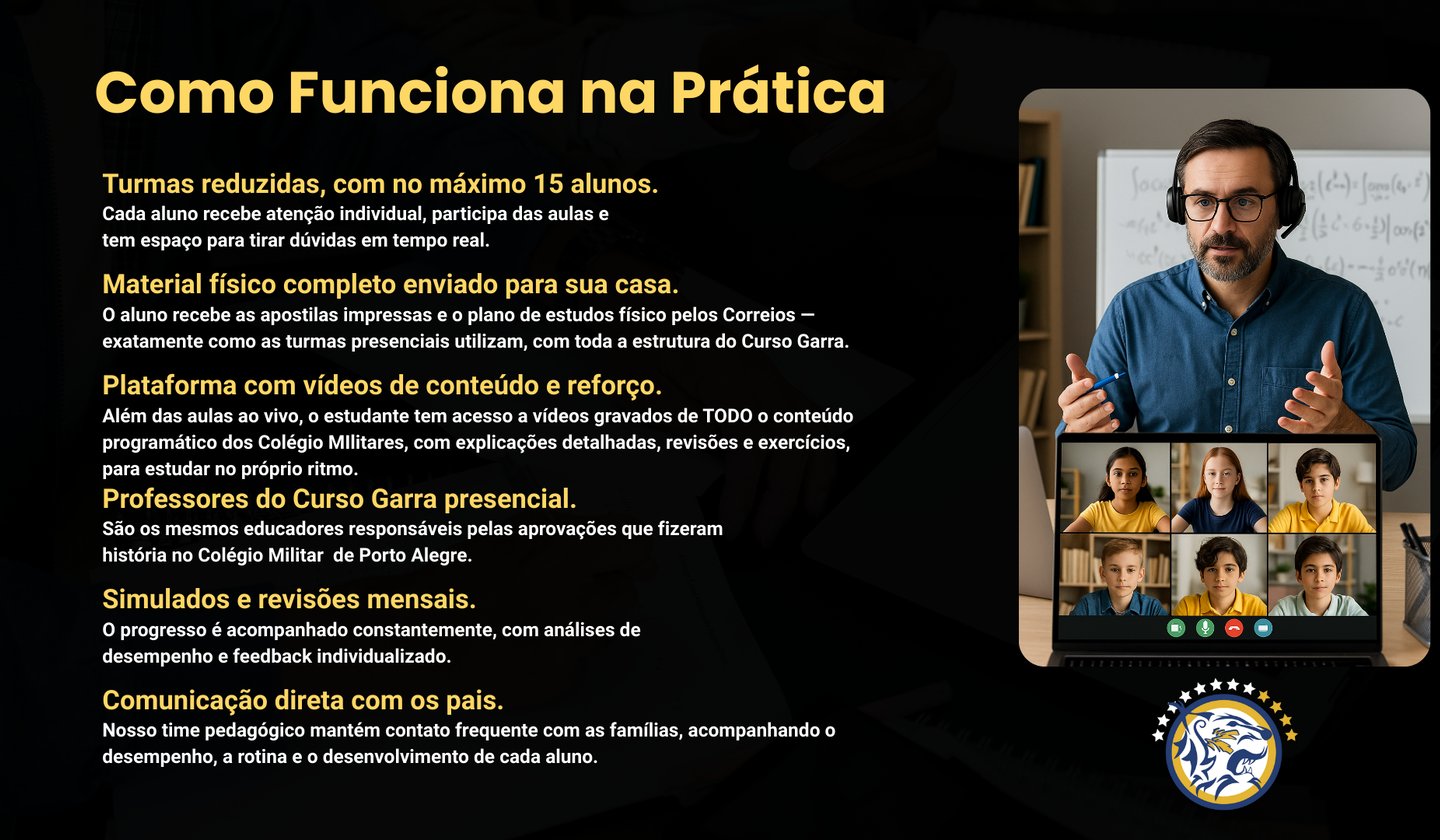 Especialistas na preparação de alunos para o Colégio Militar. Nosso método é estruturado para oferecer ensino de alta performance, foco no aprendizado real e acompanhamento personalizado para cada estudante.